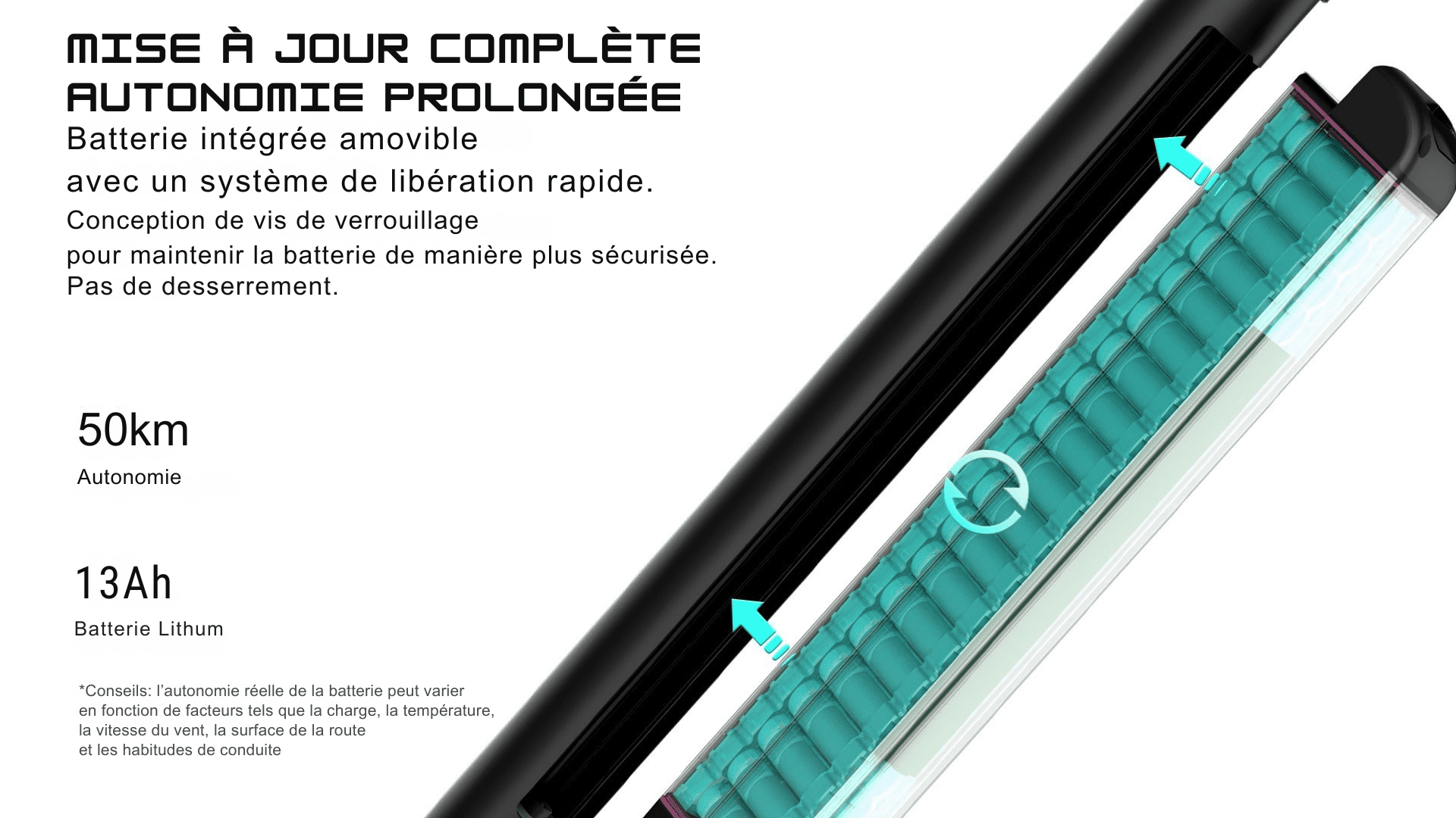 Équipée d’un moteur brushless de 450 W, la VK-Trax délivre une accélération réactive et atteint aisément les 25 km/h. Sa batterie lithium haute capacité, amovible et protégée, offre jusqu’à 50 km d’autonomie. Élégante mais robuste, compacte mais puissante, la VK-Trax est l’alliée idéale pour repousser vos limites.