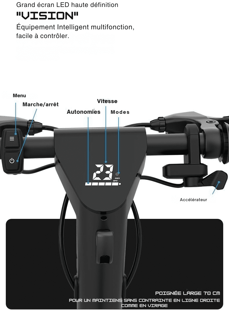 Son système d’amortissement avancé, avec trois suspensions avant et arrière, garantit confort et stabilité, même sur les terrains les plus exigeants.